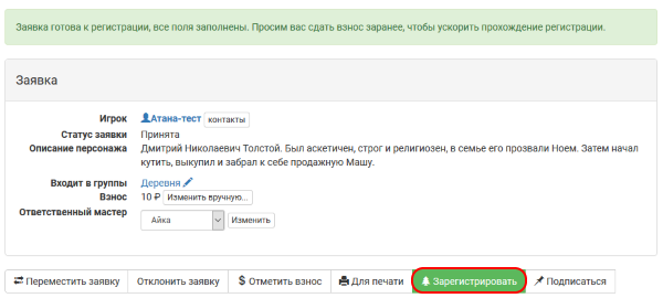 После нажатия кнопки «Зарегистрировать игрока» статус заявки меняется на «Игрок заехал», она учитывается в списке зарегистированных игроков и больше не отображается в списке персонажей, доступных для регистрации. В заявке автоматически оставляется комментарий «Пройдена регистрация на полигоне» от имени зарегистрировавшего мастера.