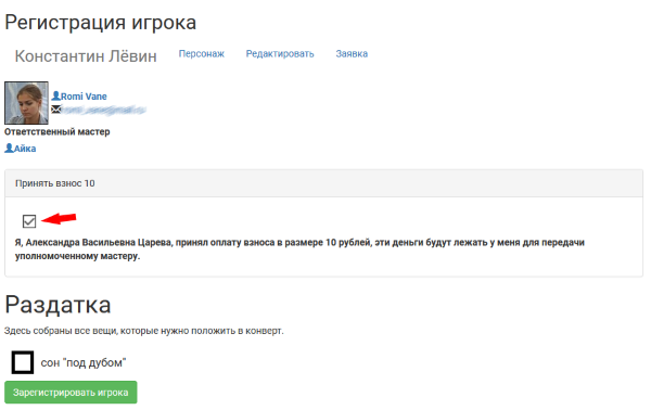 На экране регистрации выводится список раздатки — физических вещей, которые получает игрок на полигоне непосредственно перед игрой. В том случае, если вы не формировали конверты для игроков заранее, игрок может получить требуемые вещи по этому списку прямо на регистрации.