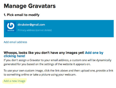 Зайти на страницу en.gravatar.com/emails и выбрать в нижней части окна “Add a new image”